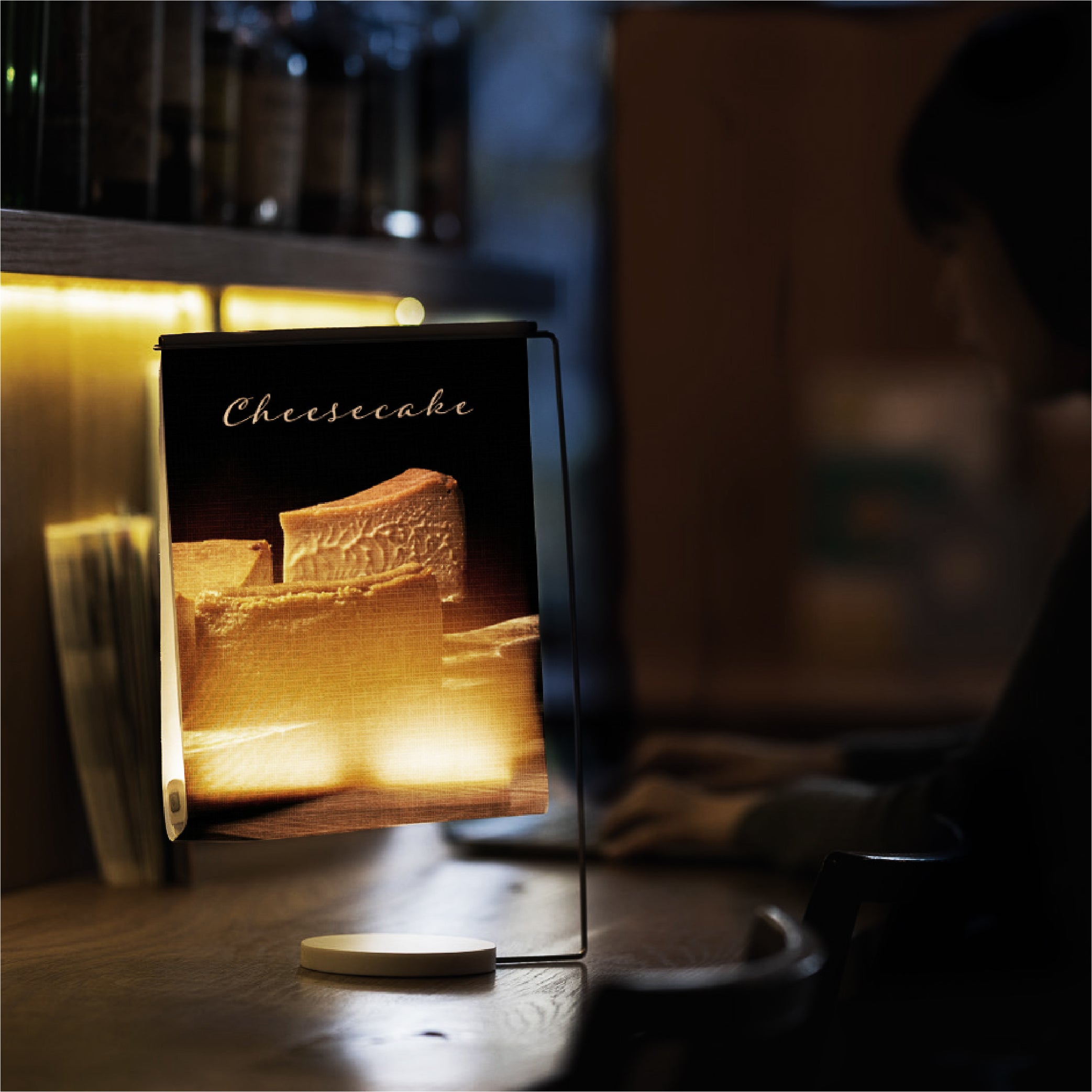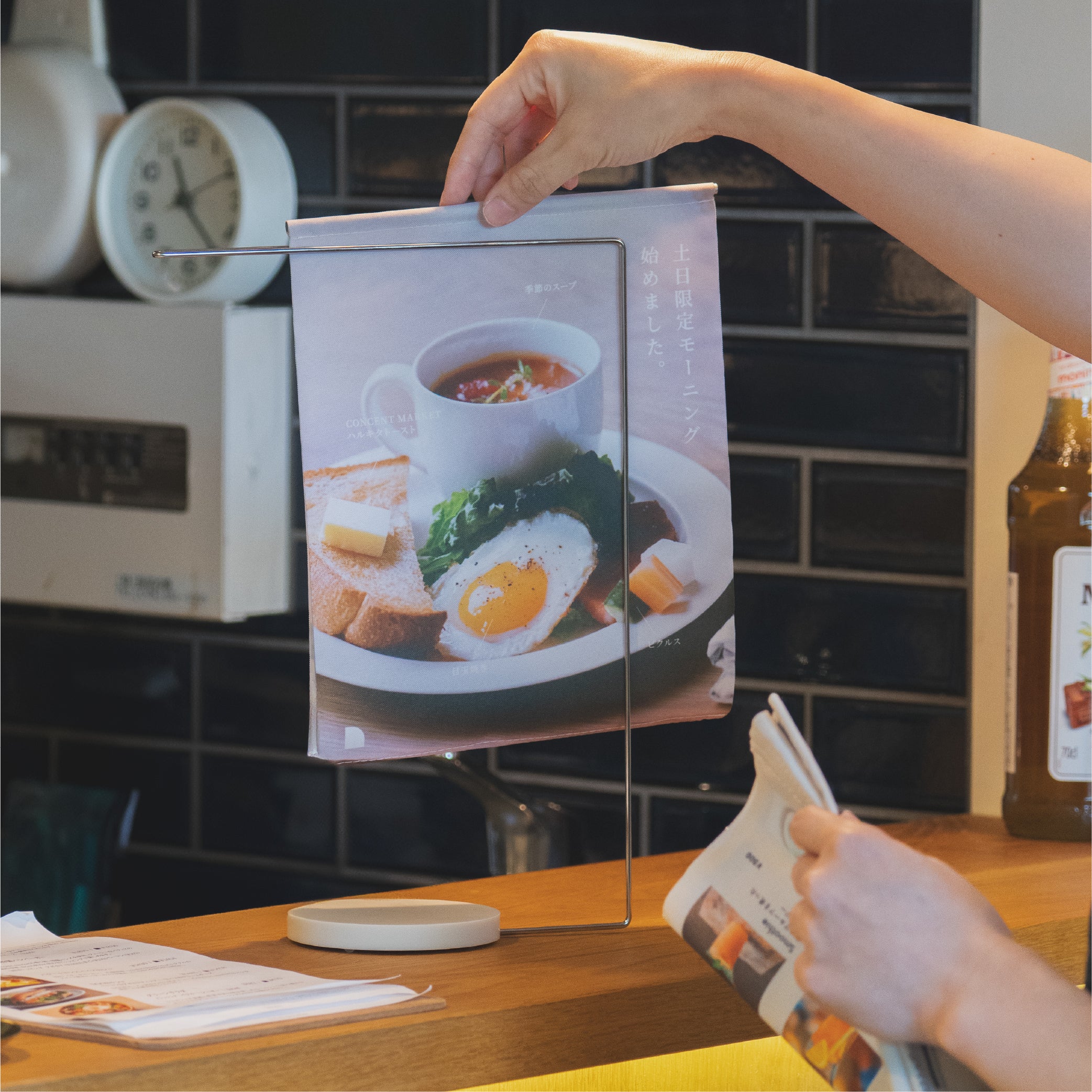 店内のテーブルやカウンターに⽴てられるスタンドタイプです。店内の雰囲気を壊すことがなく、商品などを PRすることができます。シンプルながらも上質な素材感があるので、お客様から⼀⽬置かれること間違いなしです。
